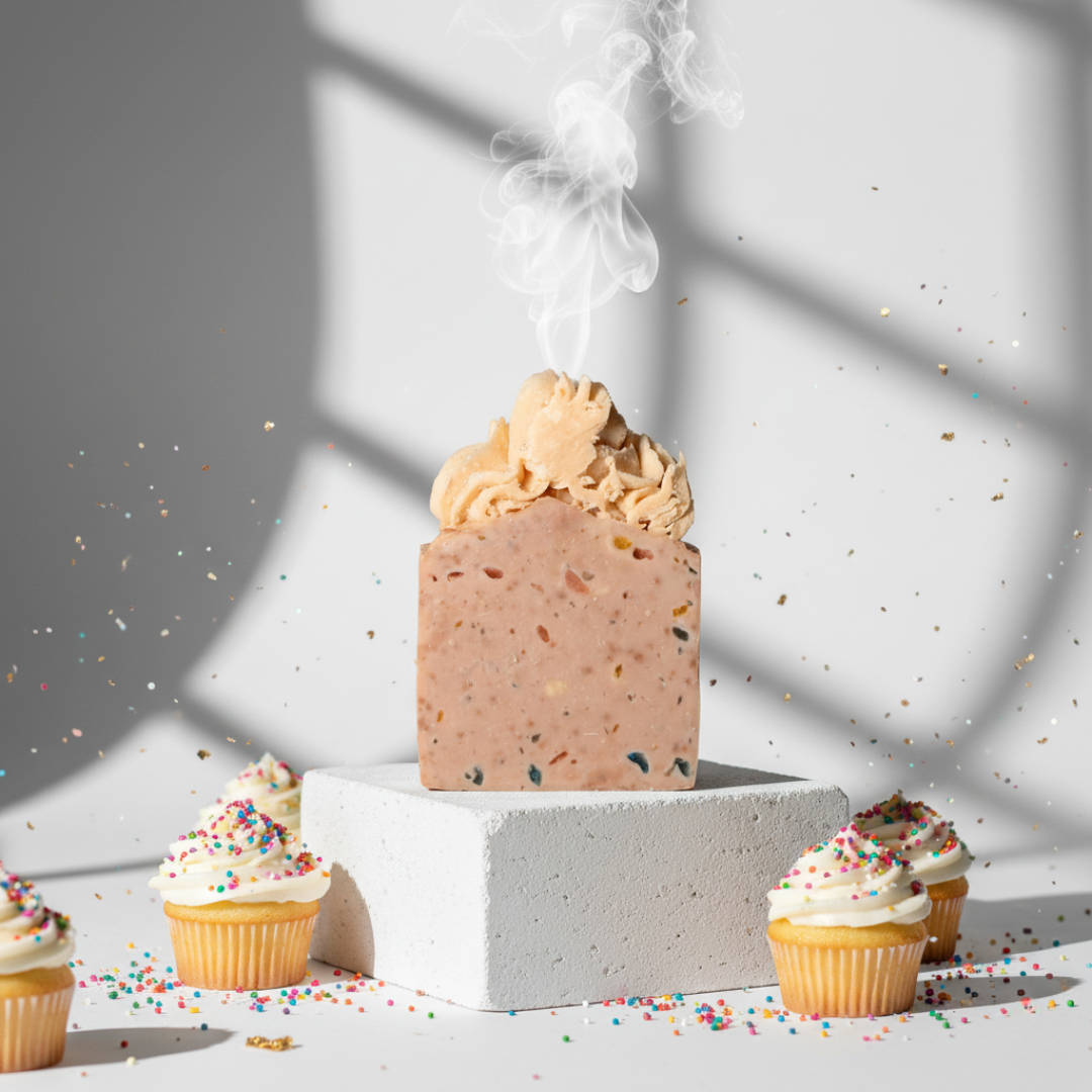 Our Kinsey soap bar smells like freshly baked cake and buttercream vanilla